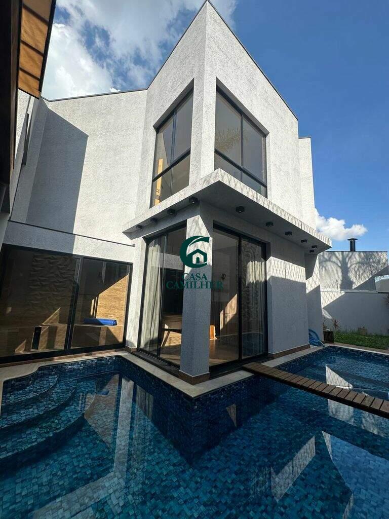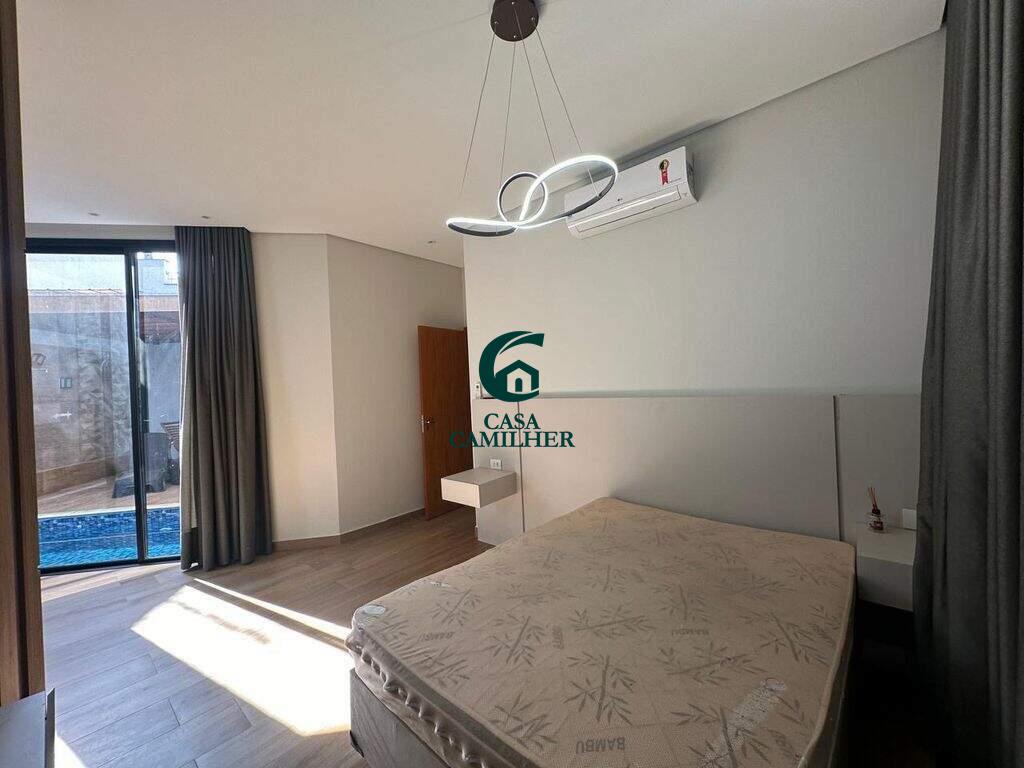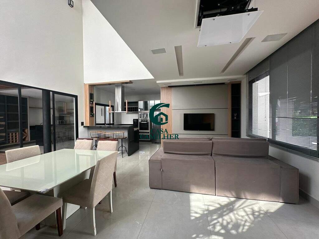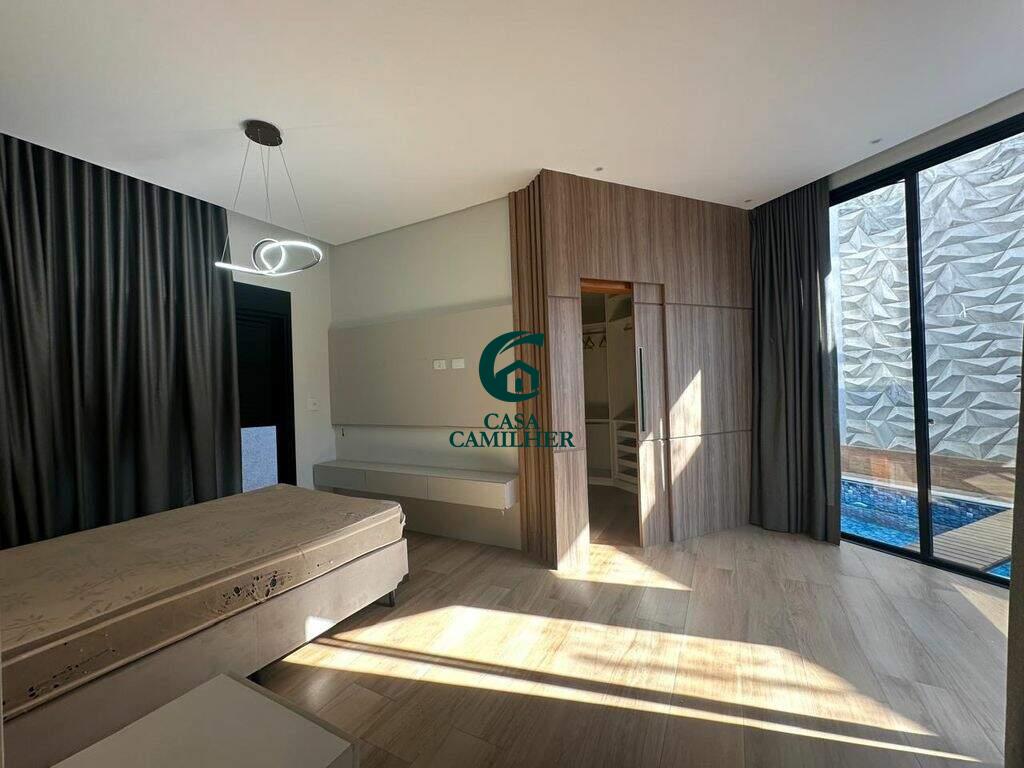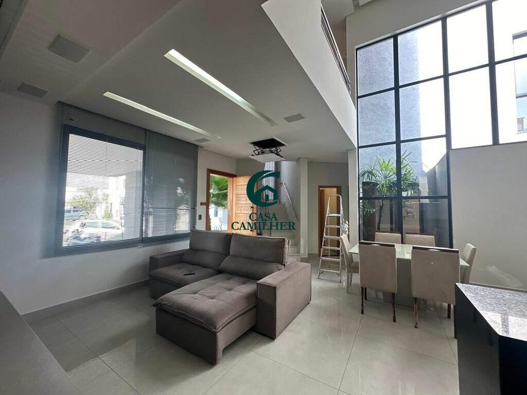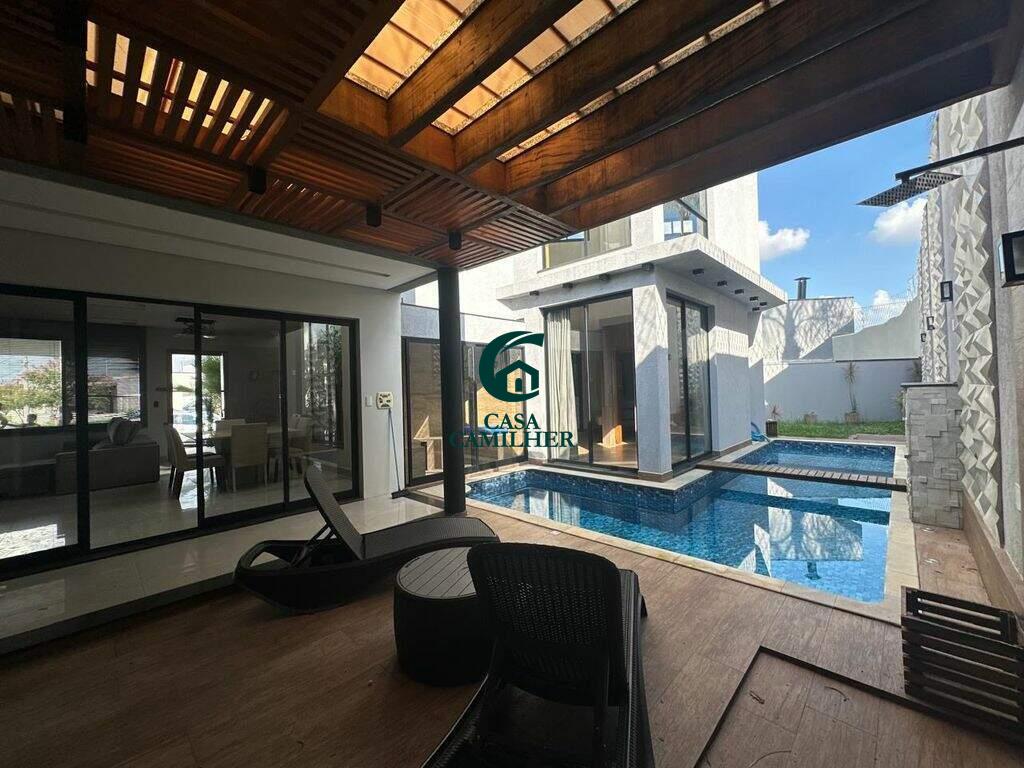 Casa Alto Padrão para Locação em Condomínio Exclusivo Desfrute do conforto e sofisticação desta belíssima casa de alto padrão, localizada em um condomínio fechado com estrutura completa de lazer e segurança. São 3 quartos, sendo 2 suítes, e 5 banheiros bem distribuídos, perfeitos para oferecer privacidade e comodidade. A área social conta com sala de estar ampla, sala de jantar, escritório, e um elegante bar. A integração com uma ampla varanda proporciona ambientes arejados e ideais para receber. A cozinha é totalmente planejada e equipada, acompanhada de uma prática área de serviço. O destaque vai para o espaço gourmet encantador, perfeito para momentos especiais com amigos e família, além de contar com uma piscina, spa com jacuzzi e sauna privativa ? um verdadeiro refúgio de bem-estar em casa. Garagem coberta para 2 carros. O condomínio oferece infraestrutura completa de lazer, segurança 24h e até mercadinho interno, trazendo mais comodidade e praticidade ao seu dia a dia. Agende uma visita e venha se encantar com seu novo lar!