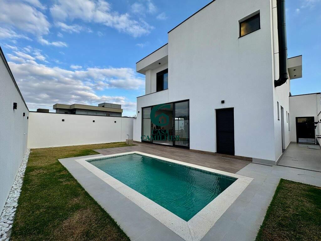 Sobrado com piscina à venda em condomínio fechado A casa contém 3 suítes, um escritório podendo ser reversível a um quarto , cozinha integrada com área gourmet, 2 banheiros, sala de TV integrada com sala de star, dispensa, lavanderia, piscina a casa será entregue com planejados em todos os cômodos e mais os vidros das sacadas. Agende já a sua visita